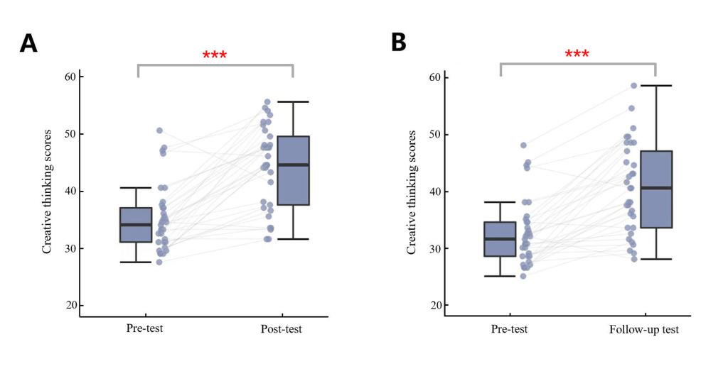 研究者还使用了t检验来解构交互作用。在图表2a中,实验组的后测得分显著高于前测得分,表明认知基础的创造性思维训练在短期内提高了学生的创造性思维能力。在图表2b中,实验组的后续测试得分与后测得分相比没有显著差异,并且后续测试得分也显著高于前测得分。这表明训练效果不仅在短期内有效,而且在六个月后仍然稳定,显示出训练的长期效果。